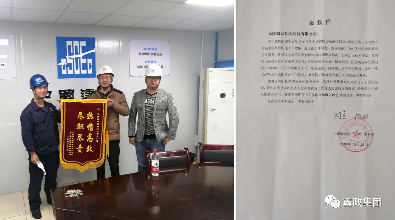 瀏覽次數(shù):1167近日,中建五局第三建設(shè)有限公司中建梅溪湖中心項(xiàng)目部和現(xiàn)場(chǎng)勞務(wù)公司長(zhǎng)沙博大建筑勞務(wù)有限公司送來(lái)錦旗和表?yè)P(yáng)信,對(duì)鑫政鋁業(yè)技術(shù)服務(wù)科楊共忠在項(xiàng)目上的出色表現(xiàn)給予了充分肯定和高度評(píng)價(jià)。_20250530091630A310.jpg)