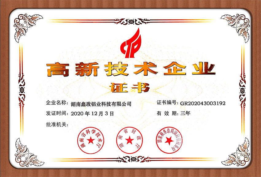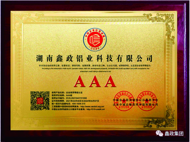 瀏覽次數(shù):1147近日,鑫政集團(tuán)子公司鑫政鋁業(yè)喜報(bào)頻傳,再獲殊榮。根據(jù)湖南省2020年高新技術(shù)企業(yè)認(rèn)定規(guī)定,經(jīng)專家評(píng)審、權(quán)威公示等程序,鑫政鋁業(yè)憑借產(chǎn)品研發(fā)、科研人才培養(yǎng)、質(zhì)量把控等方面的出色表現(xiàn),榮獲“高新技術(shù)企業(yè)”榮譽(yù)稱號(hào)。同時(shí),經(jīng)過中國企業(yè)信用誠信公示服務(wù)平臺(tái)的嚴(yán)格審核,該公司榮獲“AAA級(jí)企業(yè)信用等級(jí)”證書。
