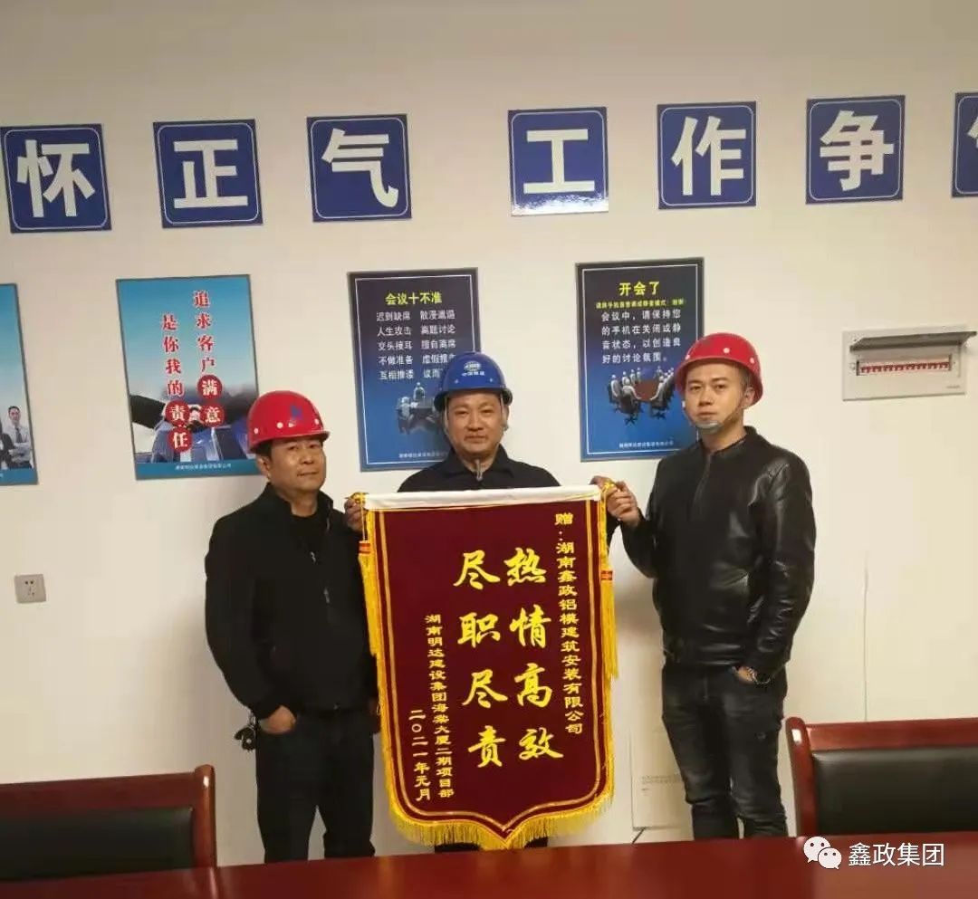 瀏覽次數:1176新年新氣象,鑫政開門紅。近日,湖南明達建設集團有限公司益陽海棠大廈項目部送來錦旗和感謝信,對鑫政安裝工程服務部申立軍同志在項目上熱情高效的工作表現,給予了充分肯定和高度評價。